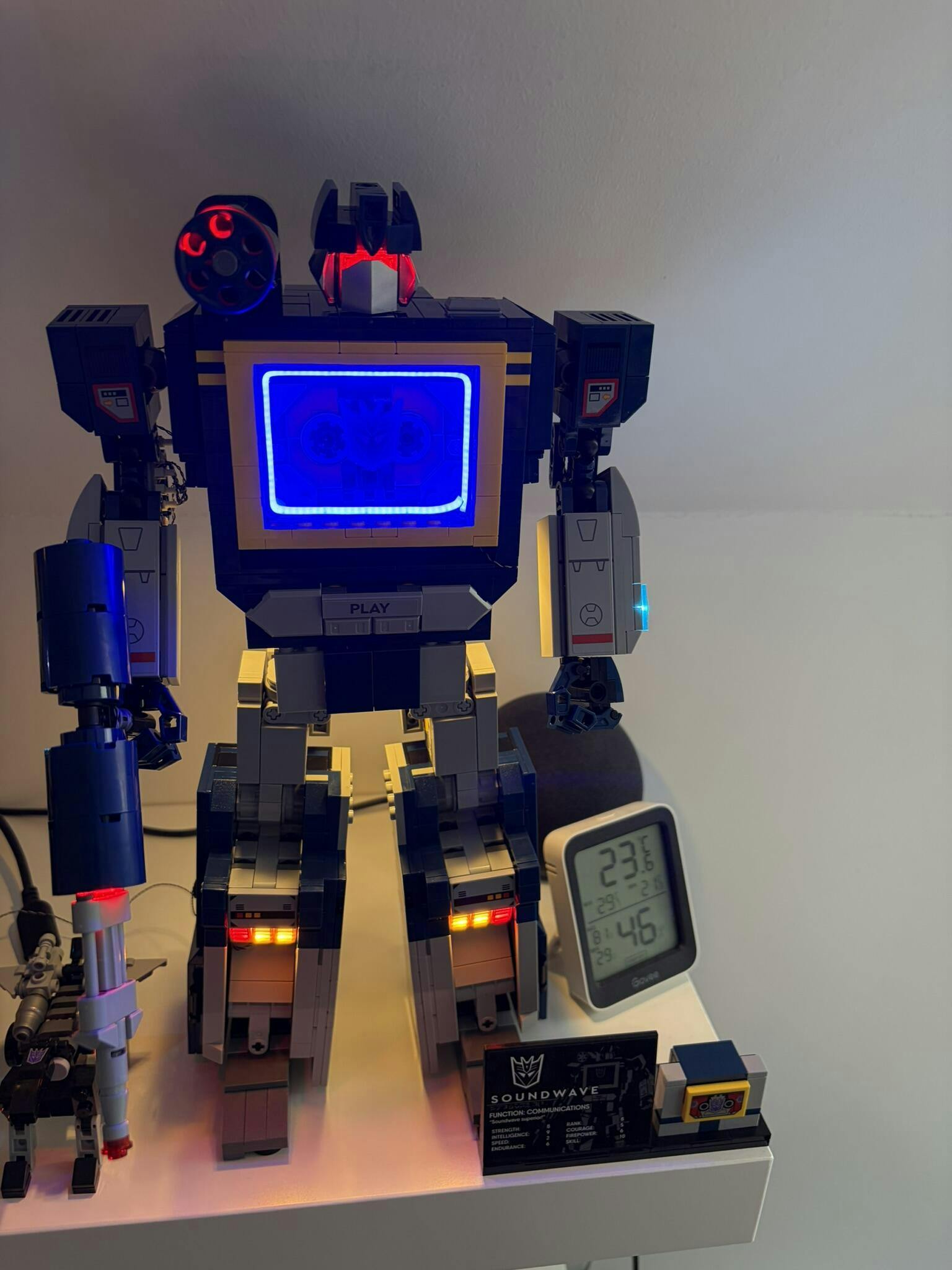 If one wants to transform their Soundwave every one and a while to "player" mode here are a few other issues. Below each "rib" on the torso the LED kit includes a 1x4 strip light with LEGO studs to snap under the model. These lights are great, except the 1x4 side blocks where the legs fold in to transform. However Briksmax also makes the same light in 1x2. Had they chosen the 1x2 variant the model could have transformed normally. This is a really easy fix, that would have made this kit better and been really small probably no cost addition change.